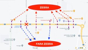 înafara trecerii pietonale din partea dreapta spre stanga conform direcției de deplasare a unității de transport.”